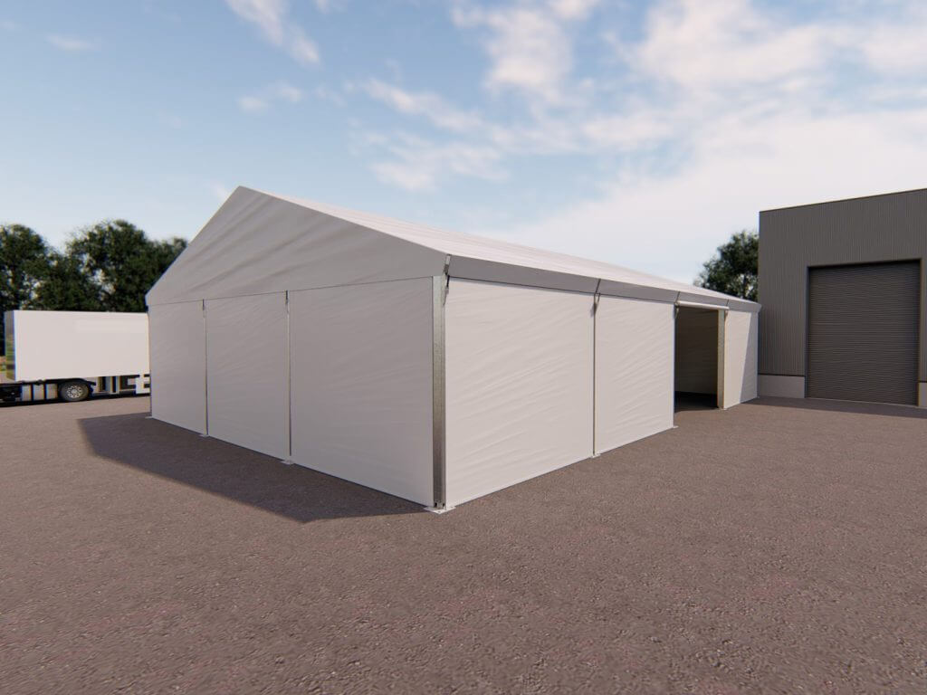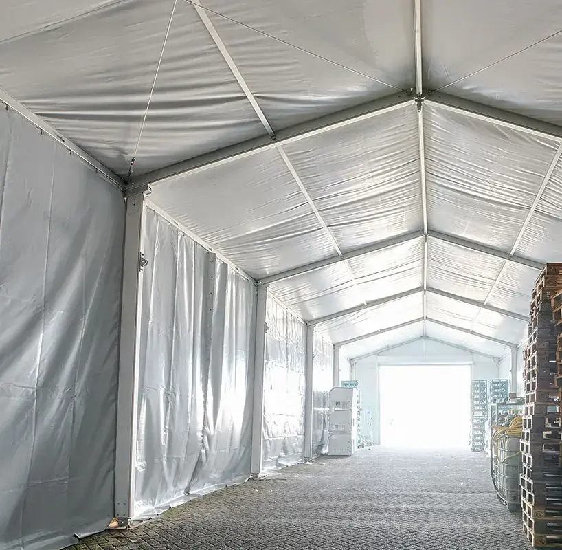 Der T3 Teilisolierte Zelthalle ist ideal für die Erweiterung von Verkaufsflächen oder zum Schutz von Waren und Maschinen.